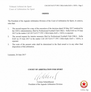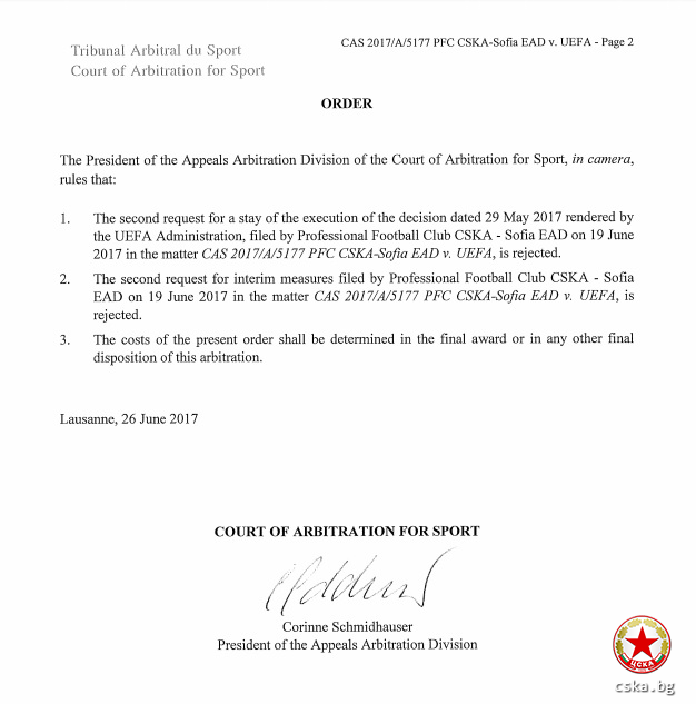 1. Второто искане за спиране на изпълнението на решението на администрацията на УЕФА от 29.09.2017, което е заведено от ПФК ЦСКА-София ЕАД на 19.07.2017 по делото CAS2017/A/5177 ПФК ЦСКА-София ЕАД срещу УЕФА, е отхвърлено.