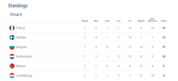 Към днешна дата, след 7 изиграни срещи, България заема трето позиция в групата с 12 точки. Лидер е Франция с 16 точки, пред Швеция с 13. Холандия е на четвърто място с 10 точки. Останалите два тима в групата – Беларус и Люксембург, са съответно с 5 и 4 точки. В последните си две срещи България приема Франция на 7 октомври и гостува на Люксембург на 10 октомври.