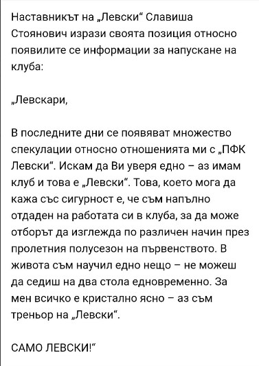 Старши треньорът на Левски Славиша Стоянович разпространи позиция свързана със своето бъдеще при “сините”. По този начин той отговори на информациите, които го свързваха с Олимпия Любляна. Ето какво написа Стоянович в позицията си, която бе разпространена чрез новото мобилно приложение на Левски:DSPORT.BG