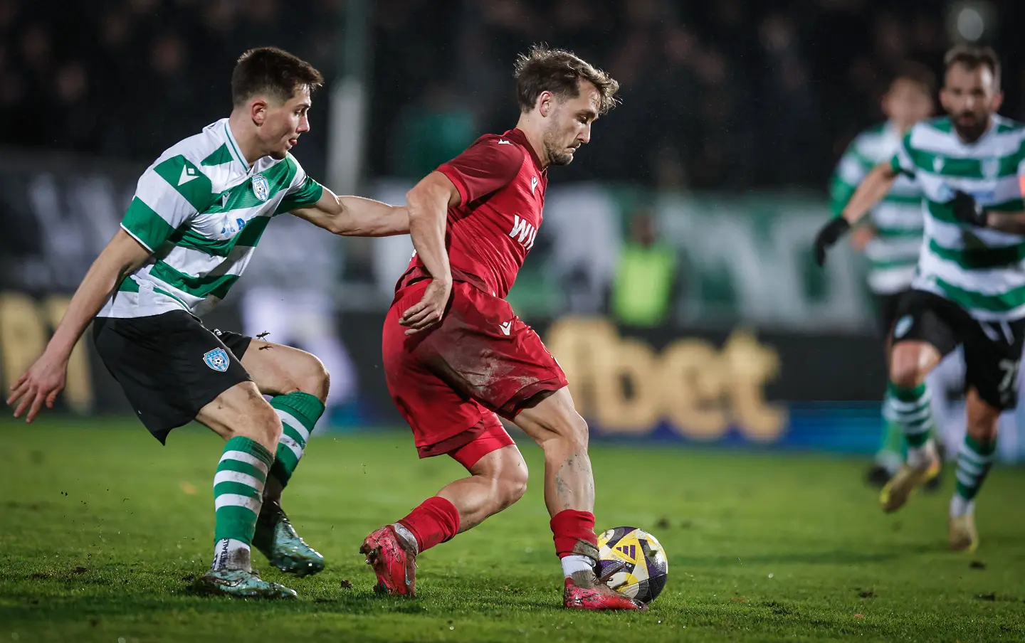Мачът на стадион “Тича” започна с високо темпо, като във втората минута Петко Панайотов успя да прати топката над главата си в наказателното поле и да я качи на главата на Йоанис Питас, но той стреля над вратата.